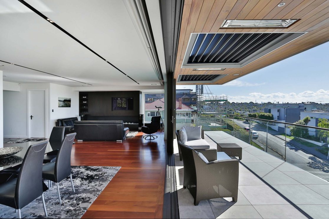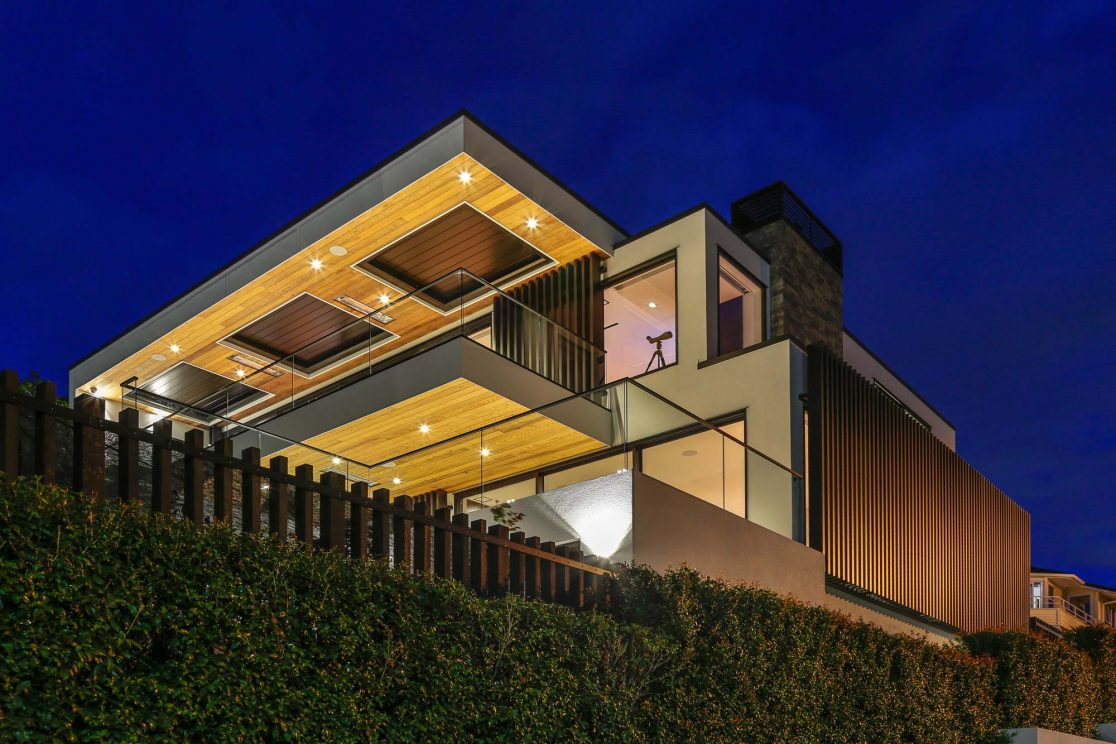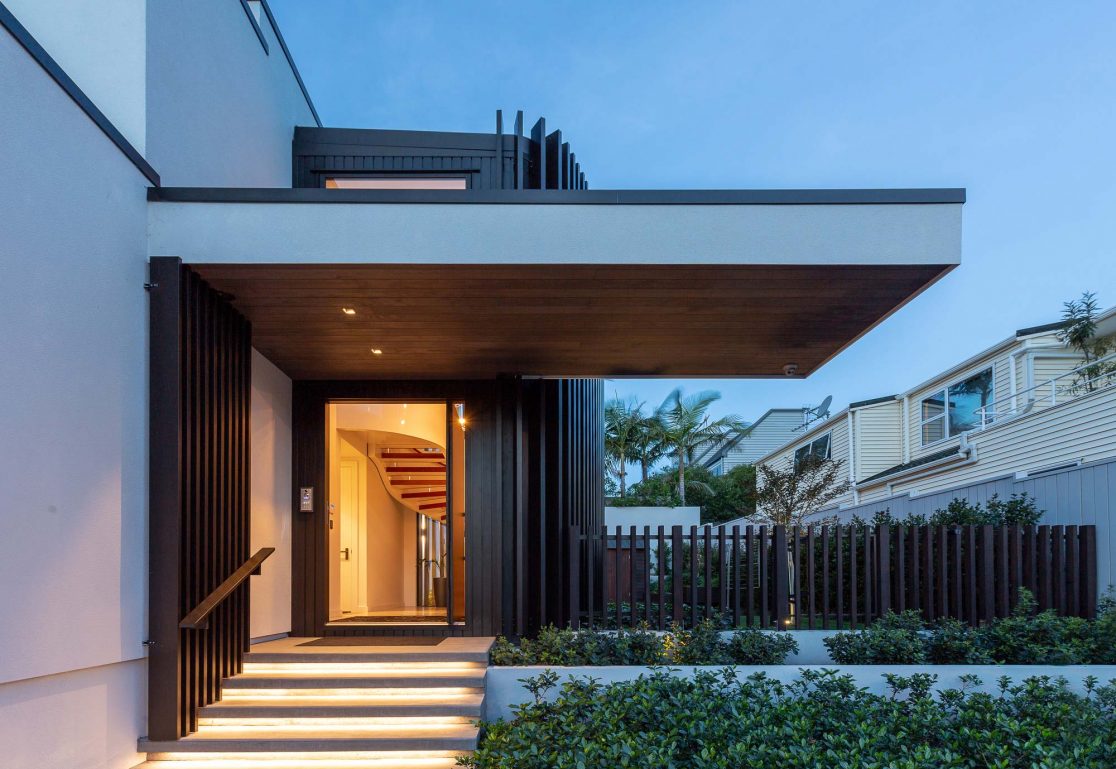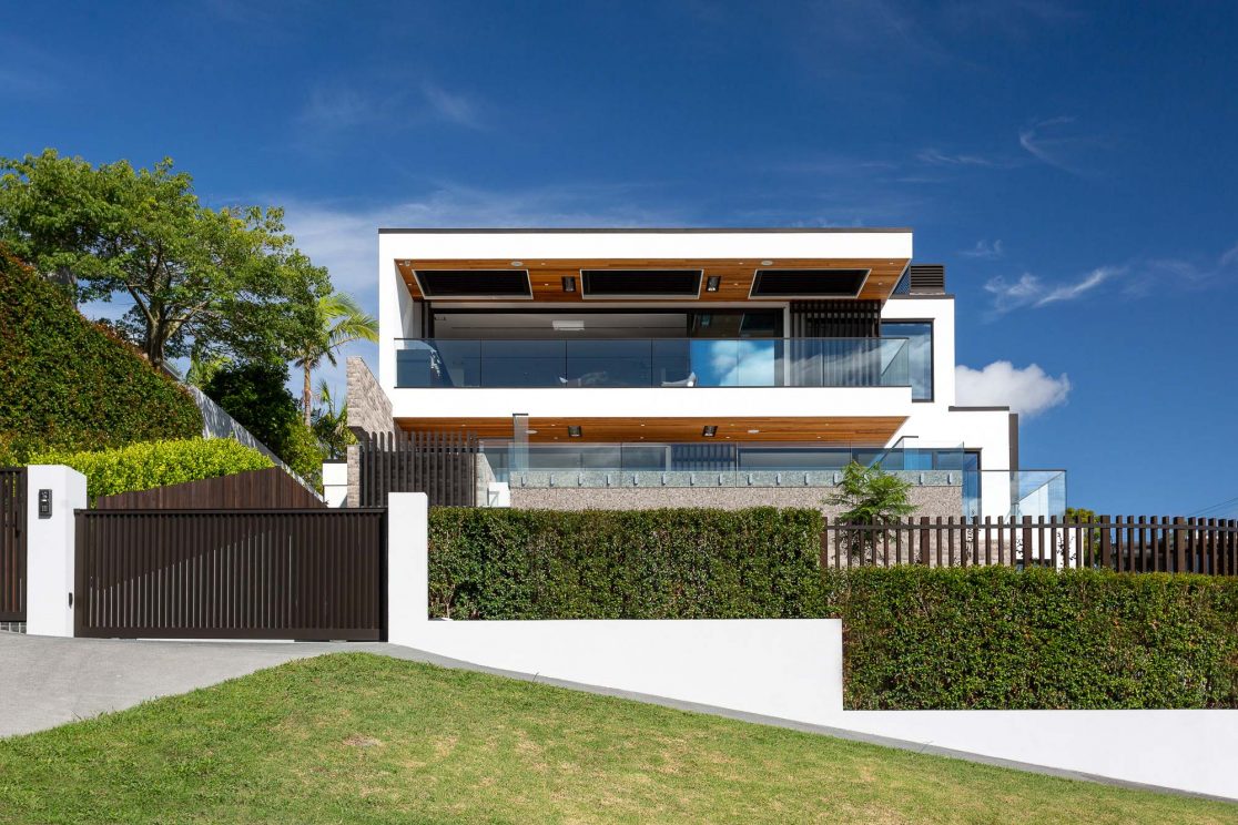 This prominent corner site in an elevated position above the beachside Auckland suburb of St Heliers offers fabulous views out over the Hauraki Gulf to Rangitoto. In keeping with its prime position, this large family home holds a commanding presence and is unashamedly modern. The crisp white design rises up over three levels and cleverly folds around the exterior spaces, giving protection from the elements and at the same time focussing the occupants’ view out across the harbour.