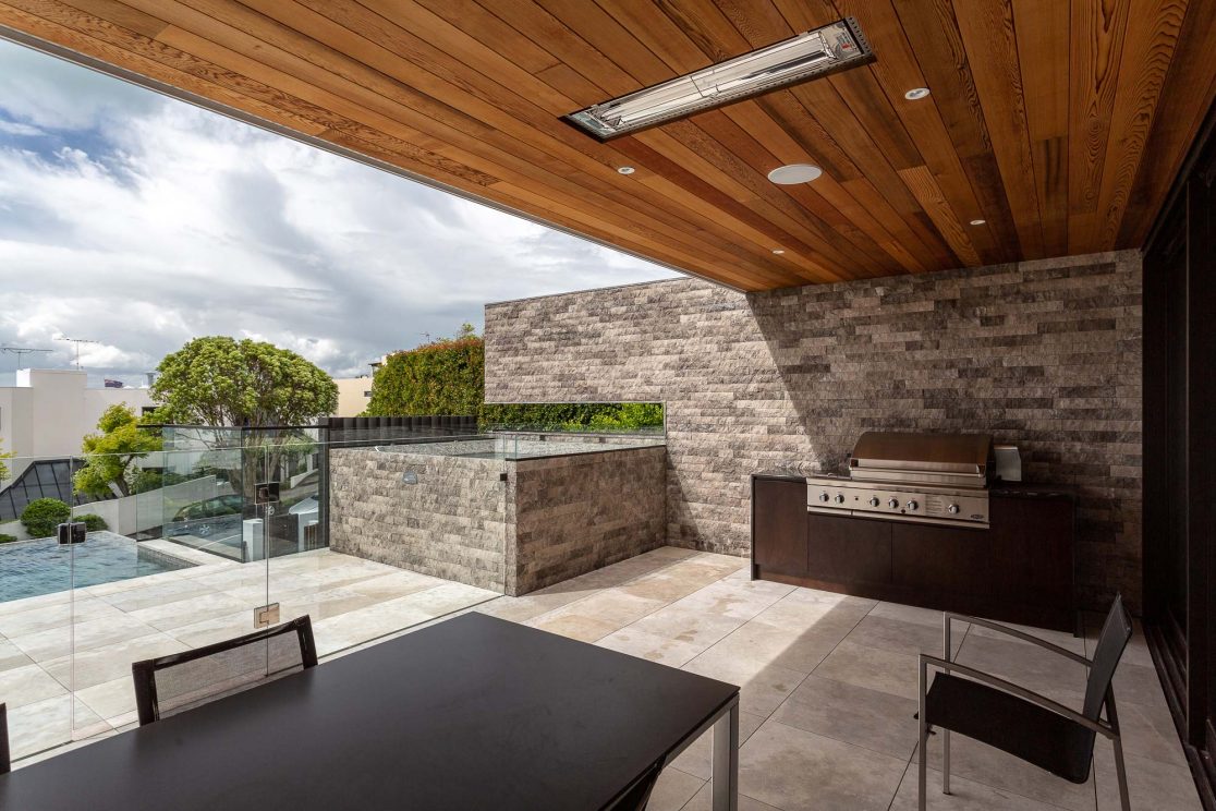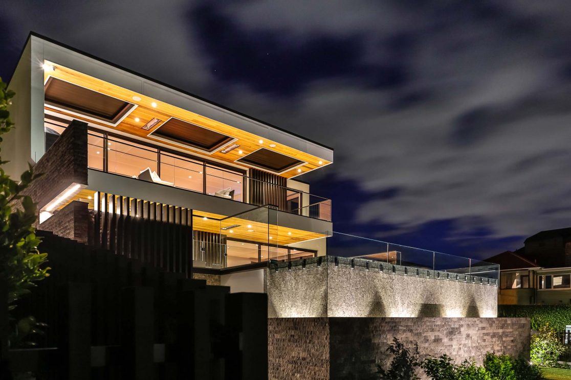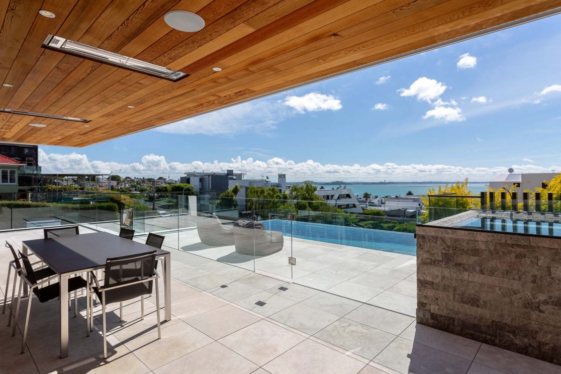 To add contrast – and also to ground the building – the pool, spa, feature wall and chimney have all been clad in rough-hewn, stone tiles. Vertical metal louvres also help to alleviate the mass of the home and provide privacy from the street front. The infinity edge pool is designed (and been colour-coordinated) to blend seamlessly with the ocean when sitting on the lower level. An extensive programme of hard and soft landscaping finishes off this splendid example of a resort-style modern family home.